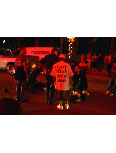 MIAMI VIBES: December 2005, is a photographic installation consisting of 49 shots in sequence depicting an unexpected event witnessed by the artist which ended up with the violent police-arrest of two youngsters persecuted for drug violation. The event took place in a crowed part of Miami on a care-free December evening and as the artist describes in her own words: “Here, the challenge which excited me and ignited my imagination, was the opportunity to record an event while it was unfolding by taking digital photos concealingly ‘in real time’. The word-play between Vibes and Vice added an additional meaning to my attempt as it refers to a well-known American-action-television-series”.